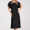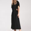 Midi dress with a simple cut, with a round neckline and short, loose sleeve falling on the shoulder. On the sides there are gatherers with tunnels and cords, creating decorative cut-outs.