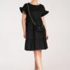 Mini dress with frills, made of light, cotton material. Loose-fitting model with short sleeves finished with a decorative frill. Flared bottom, with horizontal cuts adding volume. Includes a small bag made of the same material, suspended on a gold chain.