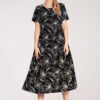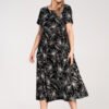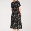 Midi dress with short sleeves and a round neckline, made of lightweight material with a white, embossed floral print. Loose fit with side ties allows to adjust the width at the waist and fit the dress to different silhouettes. The bottom slightly flared, with a horizontal seam adding volume. The model is equipped with practical pockets on the sides.