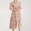 Midi dress with short sleeves and a stand-up collar at the neckline. The top is buttoned up. The entire surface is printed with a white, embossed floral motif with a rubbery texture. A thin belt for tying at the waist, made of the same material, with a wide ruffle at the bottom adding volume.