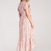 Midi dress made of lightweight material. Floral motif with an embossed, rubbery texture printed all over. Top with a round neckline, ruffle sleeves, and a button closure at the back. Waist tied with a belt made of the same material. Asymmetric dress bottom with a ruffle. The front is shorter than the back.