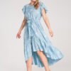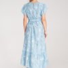 Midi dress made of lightweight material. Floral motif with raised, rubber texture printed on the entire surface. Top with a round neckline, ruffled sleeves, and a button closure at the back. Waist tied with a belt made of the same material. Asymmetrical dress bottom with a ruffle. Front shorter than the back.