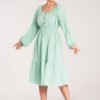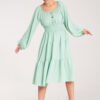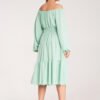 Midi dress, top ruched with a Spanish neckline. Decorated with wooden buttons and an elastic waistband emphasizing the waist.