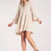 Loose dress with frills. V-neck with a delicate stand-up collar and button closure.