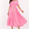 A summer midi dress with a flared cut is a perfect choice for both everyday wear and special occasions. Made of a lightweight and airy blend of viscose and nylon, it ensures comfort on warm days. The smooth fabric emphasizes the elegant yet subtle character of the dress. The top is finished with a Spanish neckline with ruches and elastic bands, beautifully exposing the shoulders and adding femininity to the outfit. The short sleeves finished with flounces add lightness and romantic charm. The model has no fastening and is put on over the head. There is a tie belt at the waist, allowing you to emphasize the silhouette and adjust the dress to your figure. Perfect for walks, summer parties, or gatherings with loved ones.