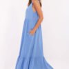 A long, summer dress with a flared cut is an ideal choice for everyday, warm days. Made of natural cotton, it provides breathability and comfort even in the hottest weather. The model with wide straps and a sweetheart neckline subtly emphasizes the upper part of the silhouette, while the loosely falling bottom finished with a frill adds lightness and feminine charm. The dress has no fastening, which makes it easy to put on and guarantees comfort throughout the day. The smooth pattern makes it versatile and easy to style, and the practical pockets in the side seams add functionality. A must-have in a summer wardrobe, perfect for walks, shopping, or outdoor meetings.