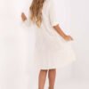 A summer shirt dress with an asymmetrical cut is a stylish and comfortable option for everyday wear. Made of lightweight, breathable cotton, it ensures comfort even on warmer days. The model stands out with its asymmetrical front and ruffle at the bottom with delicate embroidery, which adds a subtle, feminine touch to the whole look. The knee-length and looser fit make the dress look casual yet elegant. Fastened with buttons, featuring a classic collar and 3/4 sleeves with the option to roll up, it allows for easy adjustment to the outfit and weather. The practical pockets hidden in the side seams are an additional advantage. Perfect for daily outings, it combines functionality with a trendy appearance.
