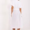 Light and comfortable summer dress with a flared cut, made of natural cotton. Smooth fabric provides comfort and works great in everyday stylizations. The model is midi length, with short sleeves and a classic, round neckline. There is a tie at the waist, which allows you to emphasize the silhouette and adjust the dress to the figure. An additional advantage are practical, slip-in pockets that add functionality and ease. It is an ideal proposal for summer days for a walk, shopping, work or meeting friends. Universal and timeless, it will be a great base for many stylizations.