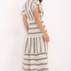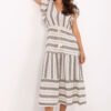 Stylish boho dress, perfect for summer days. Made of breathable, natural cotton, it guarantees comfort even in the hottest weather. The flared midi length cut beautifully complements the silhouette and emphasizes femininity, while the waist tie allows for individual adjustment. The dress has a V-neckline that slenderizes the neck and adds lightness, as well as short ruffled sleeves, giving it a girlish charm. The material is decorated with subtle embroidery, emphasizing its boho character. The model is put on over the head without fastening. It will be perfect for everyday walks, shopping or meeting friends. An ideal proposition for women who appreciate style and comfort in a summer edition.