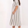 Light and comfortable boho style dress, perfect for everyday, summer stylizations. The oversized cut provides freedom of movement and comfort, while the midi length makes it perfect for both the beach and the city. Shirt-like model, buttoned, with a V-neckline that subtly accentuates the neck. Made of a blend of cotton, polyester, and other fibers, the dress is breathable, pleasant to the touch, and practical for warm days. Short sleeves and loose cut add lightness to it. The whole is decorated with stripes and decorative embroidery, giving it a characteristic boho look. An additional advantage are the pockets hidden in the side seams, functional and discreetly incorporated into the cut. Perfect for everyday outings, walks, vacation trips, or as a stylish beach cover-up.