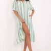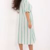 Light and comfortable boho-style dress, perfect for everyday, summer stylizations. The oversized cut provides freedom of movement and comfort of wearing, while the midi length makes it perfect for both the beach and the city. Shirt-style model, buttoned, with a V-neck that subtly emphasizes the neck. Made of a blend of cotton, polyester, and other fibers, the dress is breathable, pleasant to the touch, and practical for warm days. Short sleeves and a loose cut add lightness to it. The whole is decorated with stripes and decorative embroidery, giving it a characteristic boho look. An additional advantage is the pockets hidden in the side seams, functional and discreetly incorporated into the cut. Ideal for everyday outings, walks, holiday trips, or as a stylish beach cover-up.