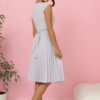 The elegant pleated midi dress by Numoco is a perfect choice for a wedding, communion, baptism, or other special occasions. The classic cut with a delicate neckline, short sleeves, and a flared, pleated bottom beautifully accentuates the silhouette and adds elegance. The tie at the waist subtly shapes the figure, and the light, high-quality material ensures comfort all day long. Limited edition. Polish product.