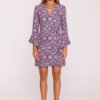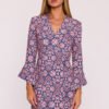 The unique dress made of fabric with a colorful plant print is a proposal that combines feminine charm with a hint of retro style. The matte finish of the material adds elegance and subtlety, while the decorative floral pattern catches the eye and enlivens the outfit. The dress features a V-neckline that beautifully elongates the neck and adds lightness. The 7/8 length sleeves are finished with a delicate flare, giving the dress a flowing and slightly romantic character. The dress is fastened at the back with a concealed zipper for comfort and aesthetic finish. The simple, slightly tailored silhouette is designed to gently accentuate the figure while remaining loose towards the bottom. The mini length adds a youthful character to the dress, making it suitable for both everyday wear and more special occasions. Designed and made in Poland for women who appreciate style, comfort, and original details.