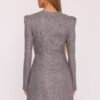 The unique dress made of tweed fabric in a melange pattern is an elegant proposal with a touch of modern character. The structural material beautifully drapes on the silhouette, giving the whole outfit elegance and class. The model has a deep V-neckline, which subtly emphasizes the feminine silhouette. Long sleeves with slightly widened shoulders and puffs add distinctiveness to the dress and give it a trendy, structural character. The closure with a concealed zipper at the back ensures comfort and aesthetic finish. An exceptional detail is the decorative brooch, chiffon bow with a jewelry pendant, which gives the dress an elegant, jewelry accent and makes it look even more special. The slightly fitted cut with a more defined waistline emphasizes the proportions of the silhouette, and the mini length adds lightness and feminine charm to the overall look. Designed and made in Poland, perfect for women who appreciate classic designs with modern, decorative details.