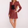 The unique dress made of tweed fabric in a melange pattern is an elegant proposal with a touch of modern character. The structural material beautifully lays on the silhouette, giving the whole outfit elegance and class. The model has a deep V-neckline, which subtly emphasizes the feminine silhouette. Long sleeves with slightly widened shoulders and puffs add boldness to the dress and give it a fashionable, structural character. The hidden zipper closure at the back ensures comfort and aesthetic finish. A special detail is the decorative brooch, a chiffon bow with a jewelry pendant, which gives the dress an elegant, jewelry accent and makes it look even more exceptional. The slightly fitted cut with a more pronounced waistline emphasizes the proportions of the silhouette, and the mini length adds lightness and feminine charm to the whole look. Designed and made in Poland, perfect for women who appreciate classic style with modern, decorative details.
