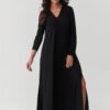 Bet on timeless classics and maximum comfort! Our long maxi dress made of high-quality viscose with a touch of elastane is a perfect choice for both everyday wear and special occasions. Thanks to the natural breathability of viscose and the elasticity of the fabric, the dress beautifully drapes on the silhouette, without restricting movement. The model has a V-neckline that subtly accentuates feminine shapes, and the slightly flared cut with side slits adds lightness and a modern character. The long sleeves make the dress suitable for any time of the year – you can wear it in spring and summer, as well as in autumn or winter paired with ankle boots or knee-high boots. Available in trendy colors: chocolate – deep, elegant shade that emphasizes beauty and adds class, black – timeless classic, indispensable in every wardrobe, khaki – stylish and versatile color in a military theme, and anthracite – deep, dark gray shade perfect for elegant and casual stylizations. This maxi dress is a perfect choice for women who appreciate comfort, minimalism, and elegant style. It looks great paired with both sporty sneakers and elegant high-heeled shoes.