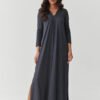 Choose timeless classics and maximum comfort! Our long maxi dress made of high-quality viscose with a touch of elastane is the perfect choice for both everyday wear and special occasions. Thanks to the natural breathability of viscose and the elasticity of the fabric, the dress beautifully drapes on the silhouette, allowing for freedom of movement. The model features a V-neckline that subtly accentuates feminine shapes, while the slightly flared cut with side slits adds lightness and a modern character. The long sleeves make the dress suitable for any time of year – you can wear it in spring and summer, as well as in autumn or winter paired with ankle boots or knee-high boots. Available in trendy colors: chocolate – a deep, elegant shade that enhances beauty and adds class, black – a timeless classic, essential in every wardrobe, khaki – a stylish and versatile color in a military atmosphere, and anthracite – a deep, dark gray shade perfect for elegant and casual styling. This maxi dress is an excellent choice for women who value comfort, minimalism, and elegant style. It looks great paired with both sporty sneakers and elegant high-heeled shoes.