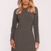 An elegant dress made of smooth fabric with a soft finish, which beautifully drapes on the silhouette. The classic, rounded neckline and long sleeves give it a timeless character. The fitted top subtly accentuates the waist, emphasized by additional flaps with decorative golden buttons. The bottom in the shape of a delicate letter A slightly widens towards the bottom, creating a trapeze silhouette that combines elegance with comfort. The concealed zipper at the back ensures comfort and aesthetic finish, while the knee-length makes this dress perfect for both business meetings and more formal occasions. Designed and made in Poland.