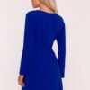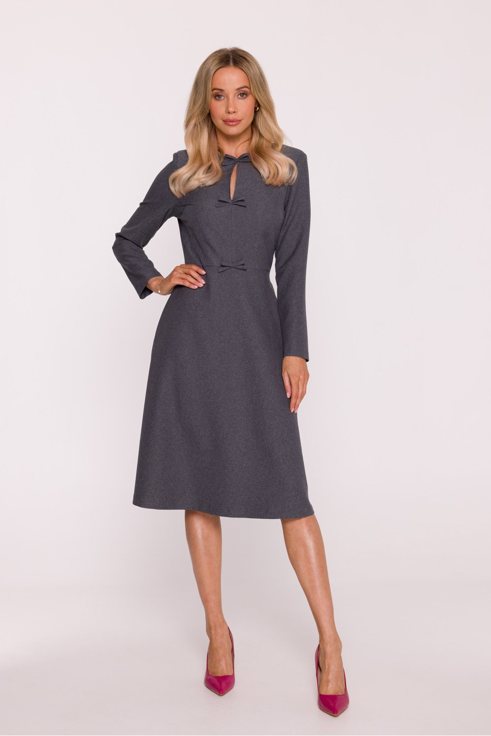 An elegant dress made of smooth fabric with a soft finish, which beautifully drapes on the silhouette. Classic, rounded neckline and long sleeves give it a timeless character. The fitted top subtly emphasizes the waist, accentuated by additional flaps with decorative golden buttons. The bottom in the shape of a delicate letter A slightly widens towards the bottom, creating a trapeze silhouette that combines elegance with comfort. A concealed zipper at the back ensures comfort and aesthetic finish, and the knee-length makes this dress perfect for both business meetings and more formal occasions. Designed and made in Poland.