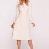 An elegant dress made of smooth fabric, fully lined, which ensures comfort and perfect material draping. A semi-circular neckline with a subtle slit adds a delicate accent to the whole, and long sleeves emphasize the classic character of the model. A trapezoidal silhouette with a loose A-line shape guarantees comfort and lightness, while decorative bows on the front give the dress a girlish charm and exceptional elegance. A looser bottom at the hips and a knee-length make the model extremely versatile and suitable for many occasions, from family gatherings to formal events. Designed and made in Poland.