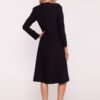 Dress in a trapezoidal cut, made of smooth fabric with a subtle melange structure. The semi-circular neckline has been enhanced with a delicate slit, adding lightness to the whole. Long sleeves emphasize the elegant character of the model, and practical pockets hidden in the side seams increase wearing comfort. The front is decorated with decorative bows placed in the middle, giving the dress a girlish charm and unique finish. The looser bottom in the hips in the shape of the letter A and the length below the knee make the cut look casual yet stylish. The model is unlined, fastened at the back with a concealed zipper, and is perfect for both everyday wear and more formal occasions. Designed and made in Poland.