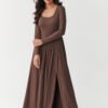 A long dress with a simple but elegant cut is a perfect choice for women who seek comfort and style in one. Made of lightweight and breathable viscose, which ensures comfort throughout the day. The dress’s cut is extremely versatile and timeless, combining classic style with modern accents. The fitted top of the dress emphasizes the silhouette, while the loose, gently flared bottom material masks imperfections and provides freedom of movement and lightness. A subtle side slit not only adds a sensual character to it, but also gives the dress a dynamic, trendy look. Long sleeves add elegance and make the dress perfect for cooler days. Thanks to this combination of cut, the dress is suitable for many occasions, from everyday meetings, through evening outings, to more formal events. This is a proposal that combines femininity, comfort, and modernity, proving itself in various stylizations and circumstances.