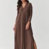 Go for timeless classics and maximum comfort! Our long maxi dress made of high-quality viscose with elastane is the perfect choice for both everyday wear and special occasions. Thanks to the natural breathability of viscose and the flexibility of the fabric, the dress beautifully drapes on the silhouette, not restricting movement. The model has a V-neckline that subtly accentuates feminine shapes, and the slightly flared cut with side slits adds lightness and a modern character. Long sleeves make the dress suitable for any time of the year – you can wear it in spring and summer as well as in autumn or winter paired with ankle boots or knee-high boots. Available in trendy colors: chocolate – a deep, elegant shade that enhances beauty and adds class, black – a timeless classic, indispensable in every wardrobe, khaki – a stylish and versatile color in a military theme, and anthracite – a deep, dark gray shade perfect for elegant and casual stylings. This maxi dress is an excellent choice for women who appreciate comfort, minimalism, and elegant style. It looks great paired with both sporty sneakers and elegant high-heeled shoes.