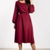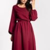 The loose-cut midi dress combines comfort with elegance. The elastic waistband adjusts to the silhouette, and the attached belt further emphasizes feminine shapes. Long puff sleeves finished with delicate gathering add lightness, and a simple round neckline makes the model remain universal and elegant. The slightly flared bottom and knee-length add class and freedom to the styling, making the dress suitable for both everyday wear and elegant occasions.