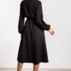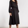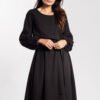 The loose-cut midi dress combines comfort with elegance. The elastic waistband adjusts to the silhouette, and the attached belt further emphasizes feminine shapes. Long puff sleeves with delicate gathering at the end add lightness, and a simple round neckline makes the model remain universal and elegant. The slightly flared bottom and knee-length add class and freedom to the styling, making the dress suitable for both everyday wear and elegant occasions.