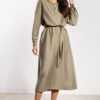 The maxi dress with a simple cut A combines elegance with everyday comfort. The ankle-length subtly elongates the silhouette, and the minimalist design looks modern. In the front, there is a row of small buttons that add lightness. The belt made of the same material allows you to wear the dress loosely or emphasize the waist, highlighting feminine proportions. Long sleeves with cuffs provide comfort and a timeless character, making the model suitable for both everyday and elegant stylizations.