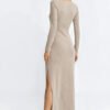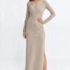 The fitted dress in a fit cut, made of ribbed fabric that emphasizes the silhouette. It has a round neckline with a subtle tear below, adding a delicate charm. Cut under the bust, which emphasizes the waist, with long sleeves, perfect for cooler days. Maxi length ensures elegance, and the side slit in the seam adds freedom of movement. Put on over the head, making it comfortable and practical for everyday and special occasions.