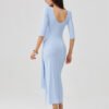 The elegant dress with a fitted silhouette beautifully accentuates the figure, and the decorative tie at the waist emphasizes feminine shapes and adds lightness to the whole look. Shoulder pads subtly shape the shoulder line, adding a distinctive character to the styling. The model has 3/4 sleeves and a deeper neckline at the back, which introduces a touch of sensual elegance. The dress was designed and made in Poland with attention to every detail, guaranteeing high quality and comfort. It will work perfectly in formal stylings, paired with classic heels and jewelry, as well as in a more casual look with sandals and minimalist accessories.