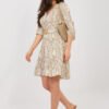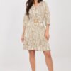 An elegant knee-length dress made of pleasant to the touch, lightweight viscose, which beautifully drapes on the silhouette and ensures comfort throughout the day. The model with a dominant print on the material attracts attention and gives the styling a distinct character. The sweetheart neckline subtly emphasizes the neckline, and the three-button fastening at the front adds a delicate, classic accent to the whole. The 3/4 sleeve with a puff finish introduces a touch of romantic style and lightness. The dress has a fastened belt that allows you to emphasize the waist and adjust the silhouette to the figure. The bottom finished with a frill gives the whole outfit lightness and feminine charm. An additional lining increases comfort and helps the material drape better. This is an ideal proposal for everyday wear, work, or meetings, combining comfort with timeless elegance.