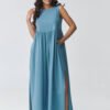 Stylish maxi dress with a loose cut is the perfect choice for women who value comfort and timeless design. The model has subtly flared bottom and striking slits on the sides, which add lightness and accentuate the silhouette. The smooth form makes the dress perfect for both everyday wear and more elegant stylings. The breathable material used ensures comfort throughout the day, while the loose fit guarantees freedom of movement. Practical pockets increase functionality, and the built-up top with delicate gathering at the waist subtly shapes the proportions of the silhouette. This is a versatile long women’s dress that can easily be paired with both sporty footwear and more elegant accessories. Perfect for a walk, meeting, vacation trip, or everyday outings.