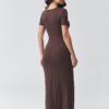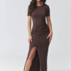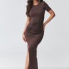 An elegant dress with ruching is a proposal for women who appreciate the combination of classic and modern details. The fitted cut emphasizes the silhouette, and the subtle ruching at the waist shapes the figure and gives the whole a unique character. This is the perfect women’s dress for special occasions, business meetings, and stylish outings. The model has a classic, high neckline and short sleeves, which gives it a minimalist and timeless look. The decorative ruching in the central part beautifully accents the waist, and the striking slit at the front slims the legs and adds a feminine lightness. The maxi length makes it an elegant dress suitable for many different occasions. Made of elastic, comfortable material, the fitted dress provides comfort throughout the day. It pairs well with both sporty footwear in a casual style and elegant accessories, creating a more formal look.