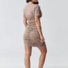 The dress was designed with the silhouette in mind. The model features a stylish heart-shaped neckline that subtly accentuates the neckline and visually slims the upper part of the silhouette. The short sleeve ensures comfort and makes the dress perfect for both everyday wear and special occasions. The tailored construction and ruching throughout the length give the whole a fashionable character and shape the figure. The elastic material fits the body, emphasizing feminine shapes and providing comfort throughout the day. The mini length showcases the legs, creating a stylish and modern look. This ruched mini dress is a perfect choice for an evening out, reception, date, or family celebration. It pairs well with both heels and elegant sandals or ankle boots. Opt for a fitted dress that combines style, comfort, and a timeless cut.
