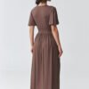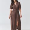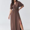 Stylish maxi dress is a perfect choice for women who value class, femininity, and comfort. The model with a striking wrap neckline beautifully emphasizes the bust line and slims the neck, giving the silhouette lightness and elegance. Short, loose sleeves provide freedom of movement and comfort for wearing all day. In the waist, there is a wrapped belt emphasizing the waist, which shapes the figure and gives proportions. The maxi length combined with a subtle slit on the leg adds sensuality to the styling and makes the elegant women’s dress perfect for parties, family celebrations, and romantic dinners. The slightly flowing material makes the maxi dress look extremely impressive in motion. It is an ideal choice for women looking for a timeless style that combines a fashionable dress for a wedding, reception, or special occasion with comfort and feminine style.