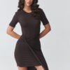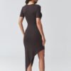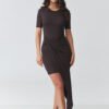 Stylish asymmetrical dress is a perfect combination of elegance and modern design. The fitted cut beautifully emphasizes the silhouette, and the striking ruching at the waist shapes the figure and gives the creation a unique character. Short sleeves and comfortable, elastic material make the ruched dress ideal for both everyday wear and special occasions. The asymmetrical bottom with an elongated panel adds lightness and originality, making the elegant dress eye-catching and fitting into the latest fashion trends. It emphasizes femininity and pairs perfectly with both heels and sporty footwear, creating a trendy smart casual look. It is the perfect choice for parties, dates, family celebrations, or evening outings. If you are looking for a dress that combines comfort and style, this fitted dress with an asymmetrical bottom is a bull’s-eye.