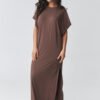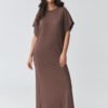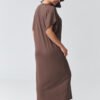 Stylish oversized maxi dress is a perfect combination of comfort and modern minimalism. The loose fit provides freedom of movement, and the simple cut makes the model fit different body types perfectly. It is an ideal proposition for women who appreciate comfort and timeless style. The model features a classic, high neckline and short, wide sleeves that emphasize the casual character of the styling. The maxi length combined with a stylish side slit adds lightness and subtly highlights the leg, giving the whole outfit a feminine touch. The soft, pleasant to the touch material makes this women’s dress suitable for everyday wear, both at work and during walks or meetings with friends. It is a versatile long dress with a slit that you can style in many ways, with sneakers for a sporty look or with elegant accessories for a more chic effect. Thanks to its simple cut, it is an excellent base for creating fashionable outfits throughout the season.