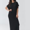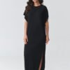 Stylish oversized maxi dress is the perfect combination of comfort and modern minimalism. The loose fit provides freedom of movement, and the simple cut makes the model fit well to different body types. This is the perfect choice for women who value comfort and timeless style. The model has a classic, covered neckline and short, wide sleeves that emphasize the casual character of the styling. The maxi length combined with a striking side slit adds lightness and subtly highlights the leg, giving the whole a feminine expression. The soft, pleasant to the touch material makes the women’s dress suitable for everyday wear, both at work and during walks or meetings with friends. This universal long dress with a slit can be styled in many ways, with sneakers in a sporty version or with elegant accessories for a more chic effect. Thanks to its simple cut, it is an excellent base for creating fashionable sets throughout the season.