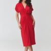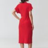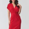 Stylish midi dress is a perfect choice for women who appreciate classic elegance and modern design. The model stands out with its unique cut, which beautifully accentuates the silhouette and provides comfort when worn. The feminine V-neck subtly highlights the upper part of the silhouette and visually lengthens the neck. The central element of the design is the striking gathering at the waist, which shapes the figure and gives the dress an elegant character. The delicately draping material creates natural drapes, making the fitted midi dress beautifully emphasize the waist and hips, while providing freedom of movement. The looser sleeves add lightness to the overall look and make the dress perfect for both everyday wear and more formal occasions. The calf-length adds class to the styling and makes the elegant midi dress a versatile element of a woman’s wardrobe.