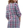 Simple plaid dress with a heart neckline. Pockets at sides. Decorative gold buttons at the back. 3/4-length sleeves with a foldover.