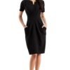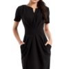 Draped dress with a sweetheart neckline. Cut off at the waist with short sleeves and pockets on the sides. At the back covered zipper.