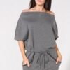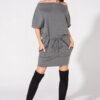 Loose-fitting knitted dress with large pockets at the front. Boat neckline finished with a welt.