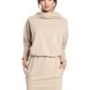 Attractive kimono dress with ribbed sleeves, high neckline and practical side pockets. Looser cut with an elasticated waistband.