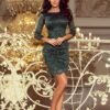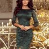 Lace fitted dress with trim on sleeves and skirt in flared green. Lace pattern may vary slightly.