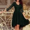Nicolle, asymmetrical dark green exclusive dress with longer back, 3/4 sleeves, neckline and lace. The skirt with a longer back will be perfect for dancing. Made in Poland.