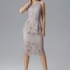 A sleeveless lace dress, a fitted top finished with a basque. The bottom of the dress is straight, lined and fastened with a concealed zipper. This is a typical model for evening occasions.