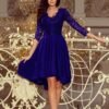 Nicolle, asymmetrical cornflower exclusive dress with longer back, 3/4 sleeves, neckline and lace. The skirt with a longer back will be perfect for dancing. Made in Poland.