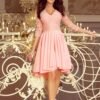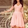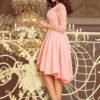 Asymmetrical exclusive dress with a longer back, 3/4 sleeves, neckline and lace. Skirt with longer back will be perfect for dancing. The colour pastel pink. Polish production. The brand numoco.
